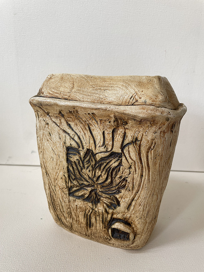 This Vase with one of my lino block prints of a stylized aloe stamped into it aloe is made from stoneware ceramic glazed with Oxides. It was created as part of an exhibition in 2017 that looked at fire and the resilience of our South African flora. this piece is currently part of the Lull exhibition at the White River Gallery.