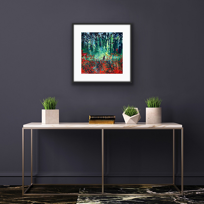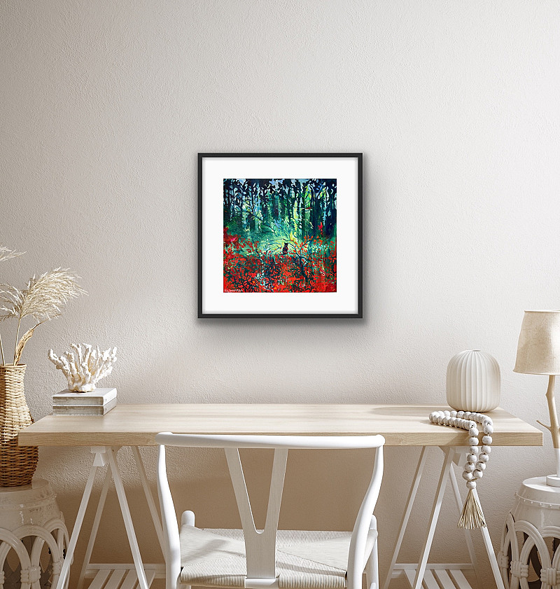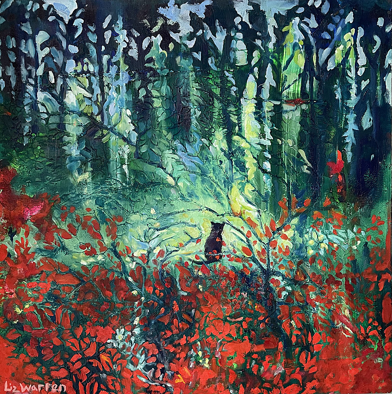 Alone, a cat in the forest. This painting was developed using the decalcomania process and using the shapes created accidentally in the paint.