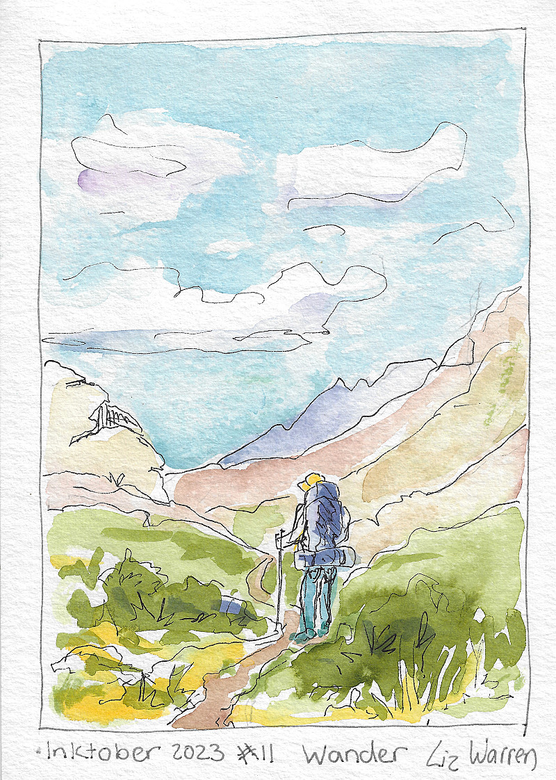 Inktober 2023 #11 Wander Tanya at the top of TsekiTseki pass from a recent hike. A5, ink drawing on 300gm watercolour paper.