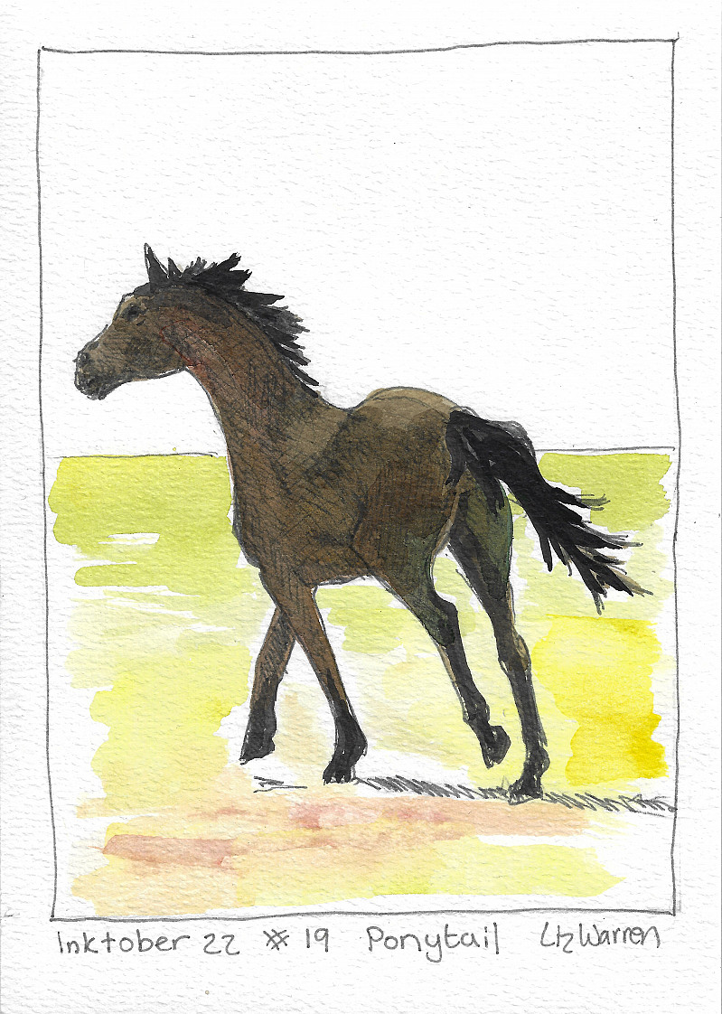 Inktober 2022: Day 19: Ponytail. Our teen’s horse galloping
