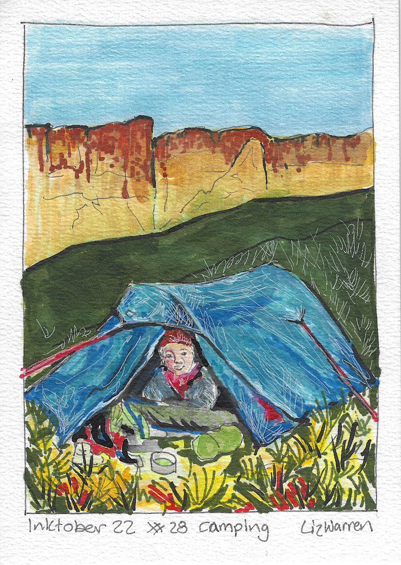 Inktober 2022: Day 28. Camping. Pen and Ink wash drawing on 300gm watercolour paper. The original is available. I will also use the image to make limited edition greeting cards as I have in previous years. Please contact me if you are interested in the original or cards.
