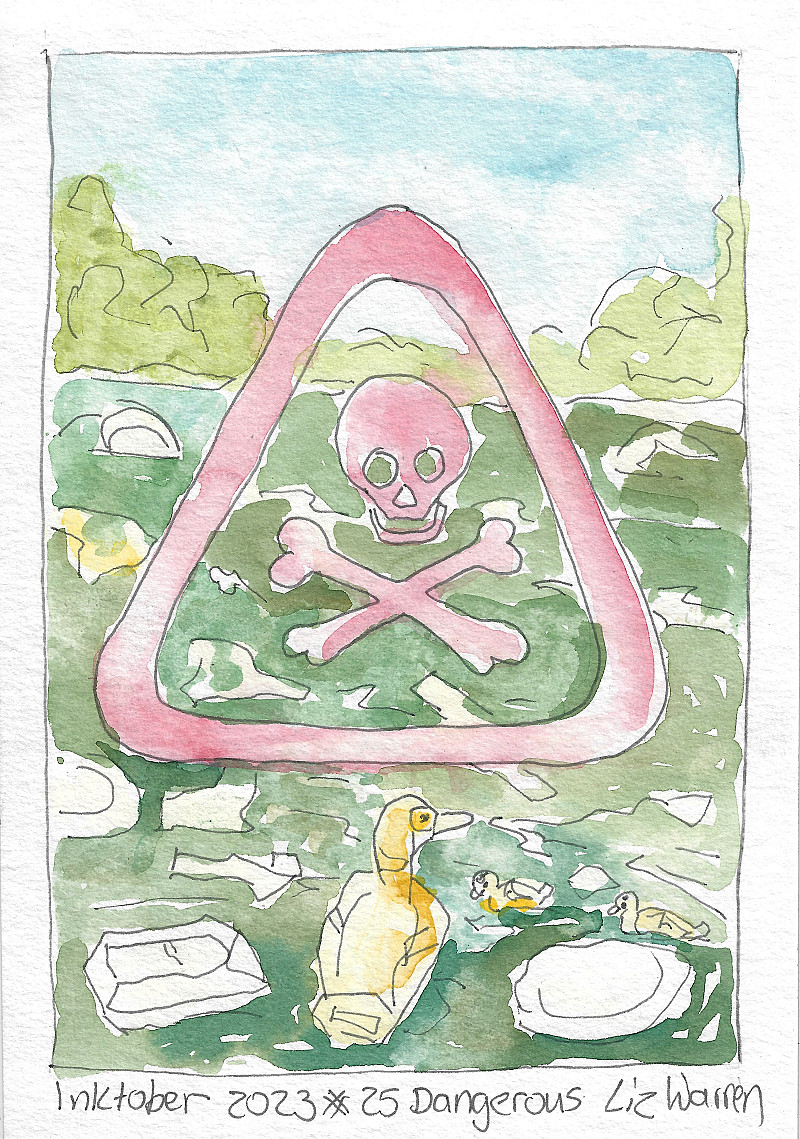 Inktober 2023 #25 Dangerous, highlighting the health of our river systems. A5, ink drawing on 300gm watercolour paper.