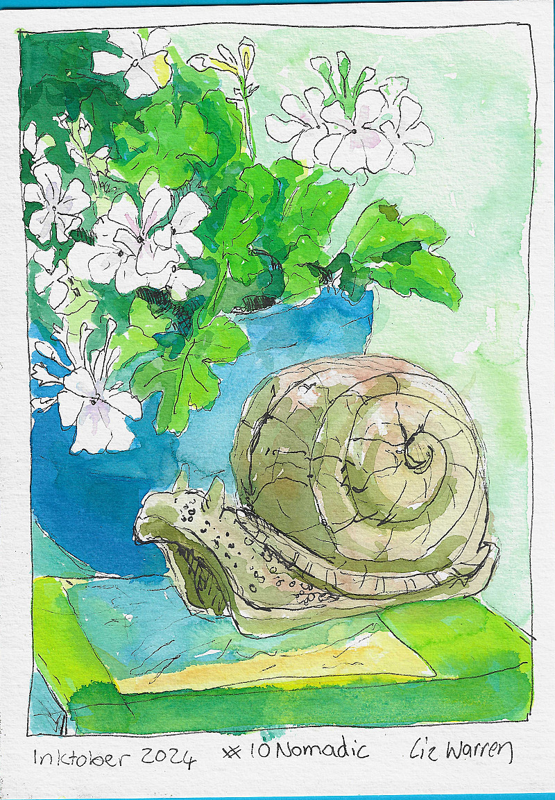 Inktober 2024 #10 Nomadic. Snails are nomadic with their houses on their backs. this is a ceramic chap that I made many years ago. He lives happily in our garden.