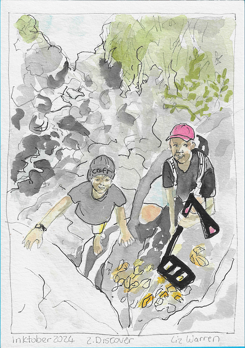 Inktober 2024 #2 Discover. Tom and his cousin having fun discovering "treasures" in Kirstenbosch gardens.