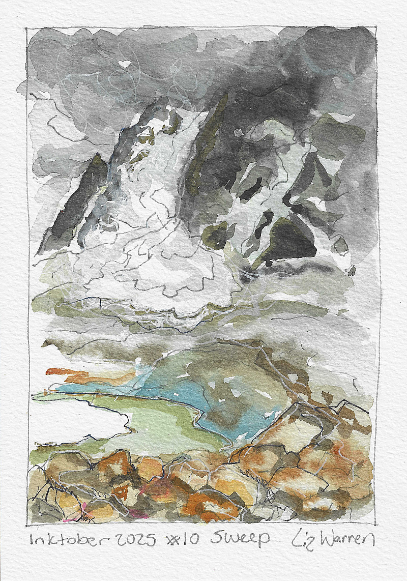 Inktober 2025 Day 10 Sweep. an avalanche sweeping down an unnamed 5000m peak onto the Panpatia Glacier. Garwal Himalaya May 2025.