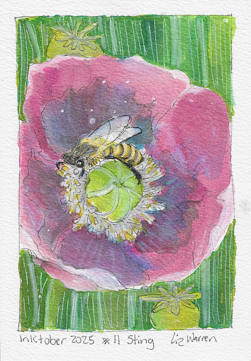 Inktober 2025 Day 11 Sting. A happy French bee on a poppy in Monet's gardens at Giverny. From a photo i took when visiting in 2024.