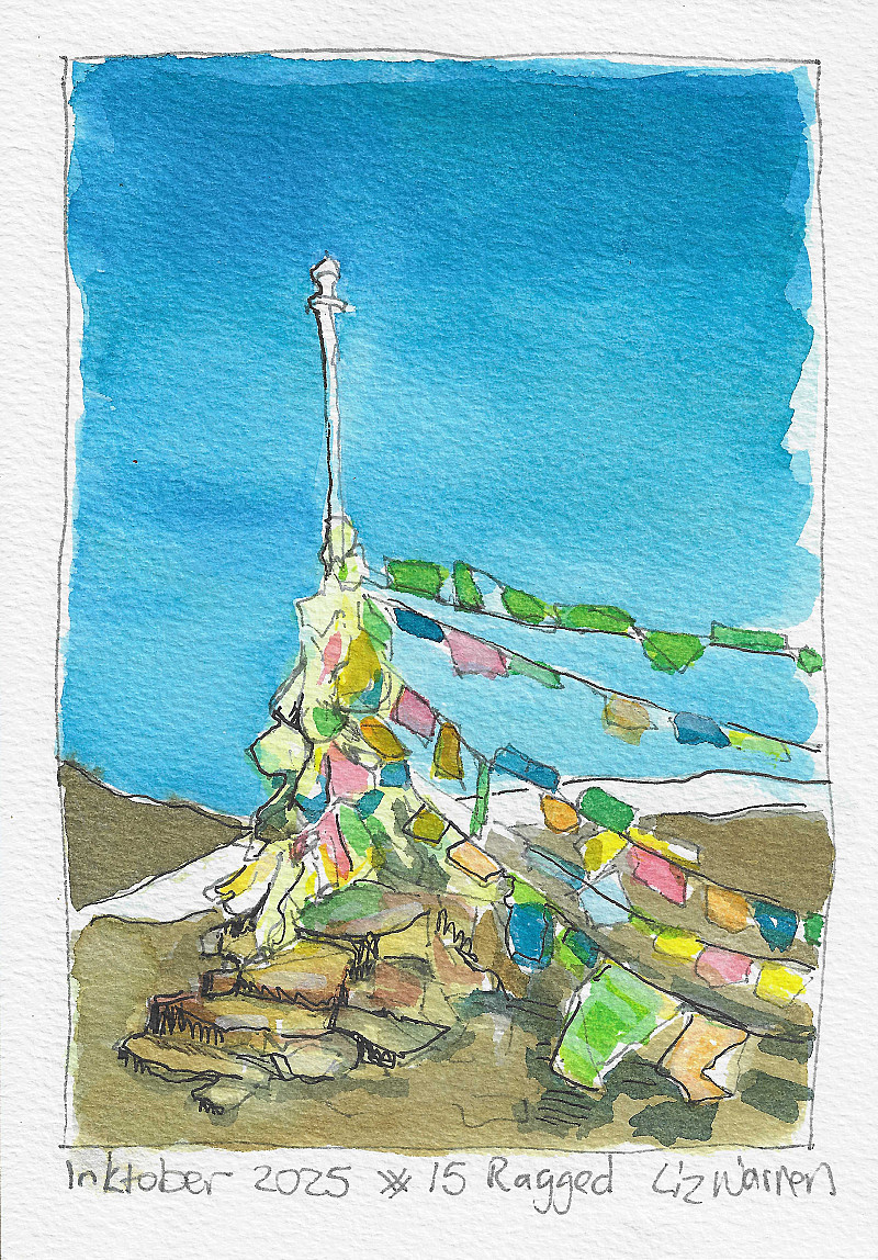 Inktober 2025 day 15 Ragged. Ragged prayer flags marking the top of the Ganda la (4980). In the Zanskar mountains in the Ladakh region of india.