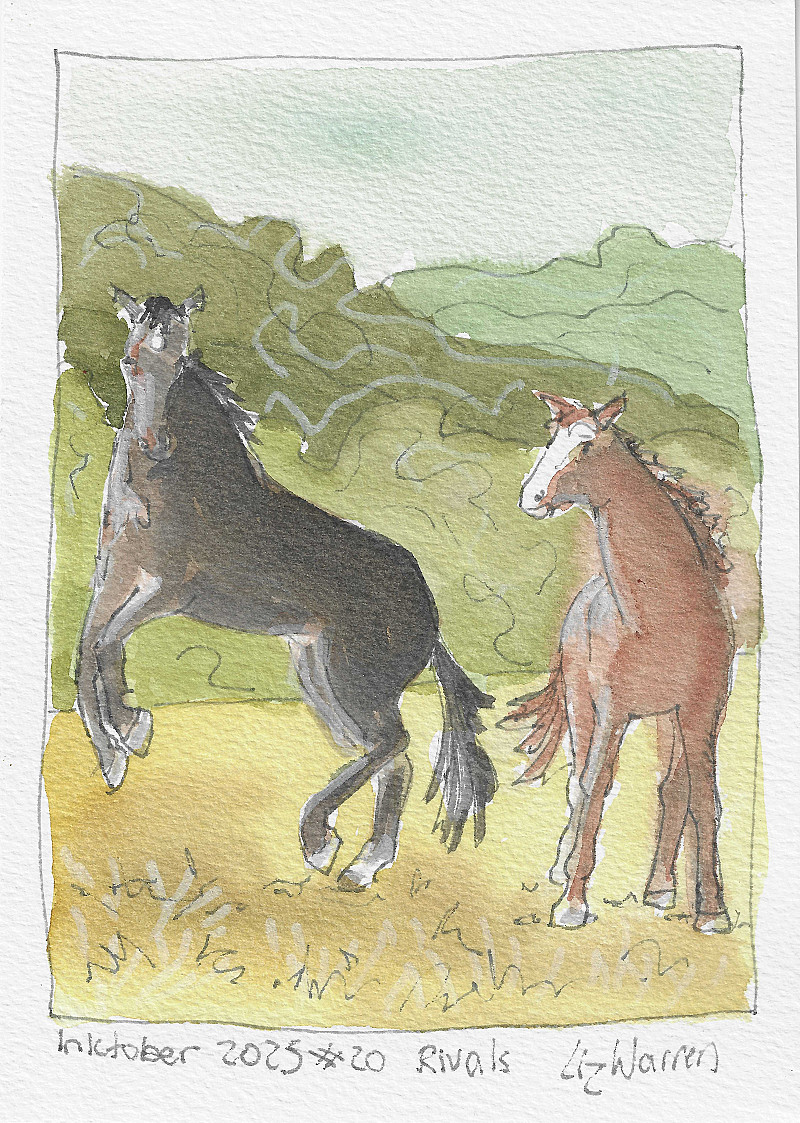 Inktober 2025 Day 20 Rivals. some friendly rivalry in the gelding paddock at Inanda Country base.