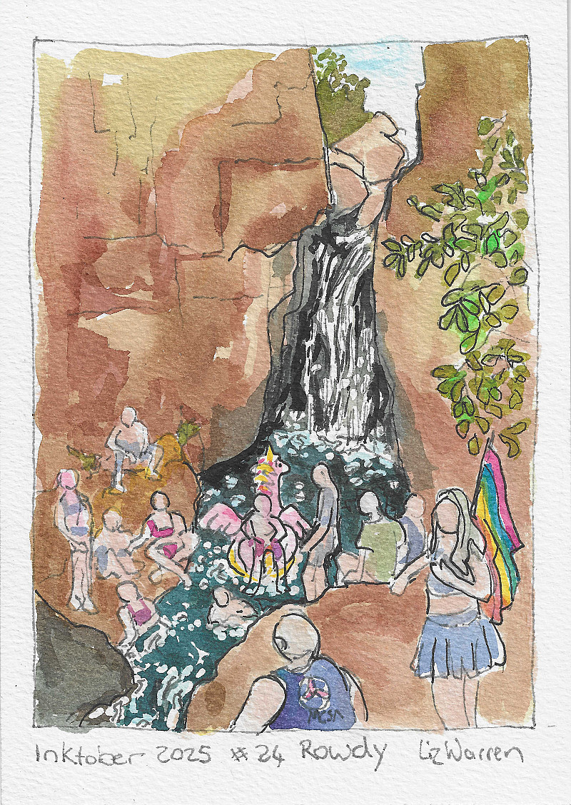 Inktober 2025 Day 24: Rowdy. we had such a fun day at the Mountain Club Pride pool party in Castle Gorge that I just had to sketch it.