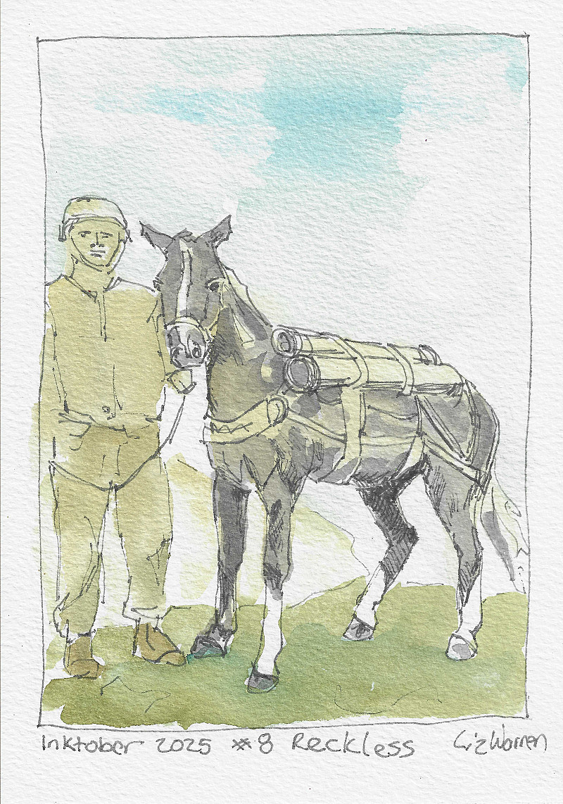 Inktober 2025 Day 8 Reckless. Sargent reckless was a Mongolian mare who served as an ammo carrier in the Korean war. she was awarded for bravery and brought back to the US for retirement. she went on to have 4 foals.