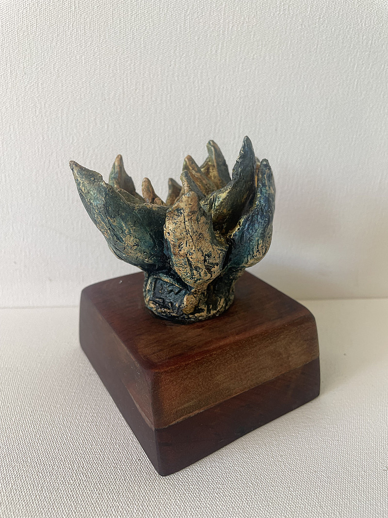 This small rugged aloe is made from stoneware ceramic glazed with Oxides, gold and blue paint and mounted on a reclaimed teak base. It was created as part of an exhibition in 2017 that looked at fire and the resilience of our South African flora. this piece is currently part of the Lull exhibition at the White River Gallery.