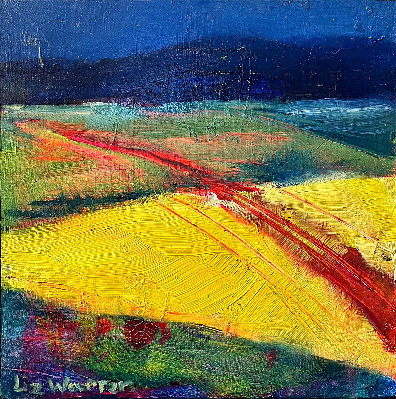 Overberg canola fields against stormy Cape mountains. oil with an acrylic under painting.