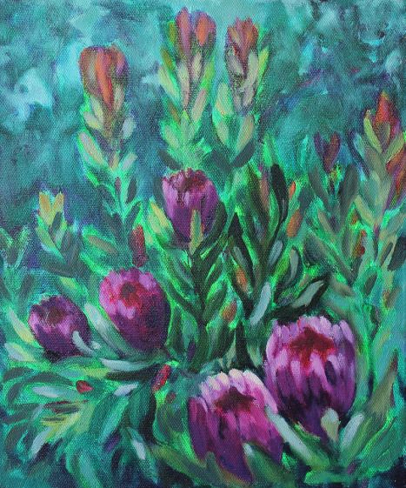Greenside pavement proteas from a photo taken on an early morning run just as the sun caught the top of the flowers.