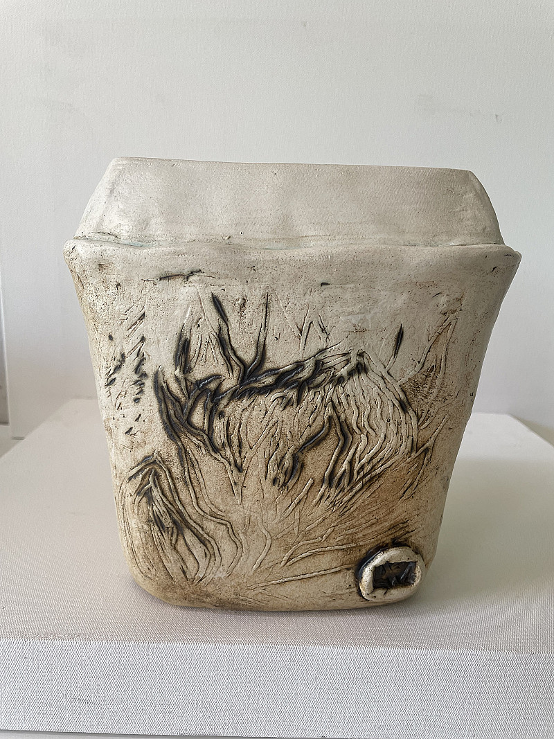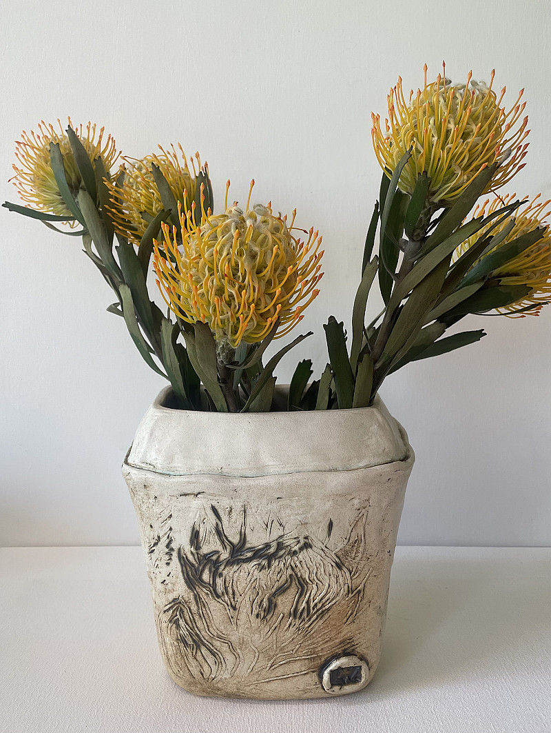 This rustic vase is made from stoneware ceramic glazed with Oxides. It was created as part of an exhibition in 2017 that looked at fire and the resilience of our South African flora. this piece is currently part of the Lull exhibition at the White River Gallery.