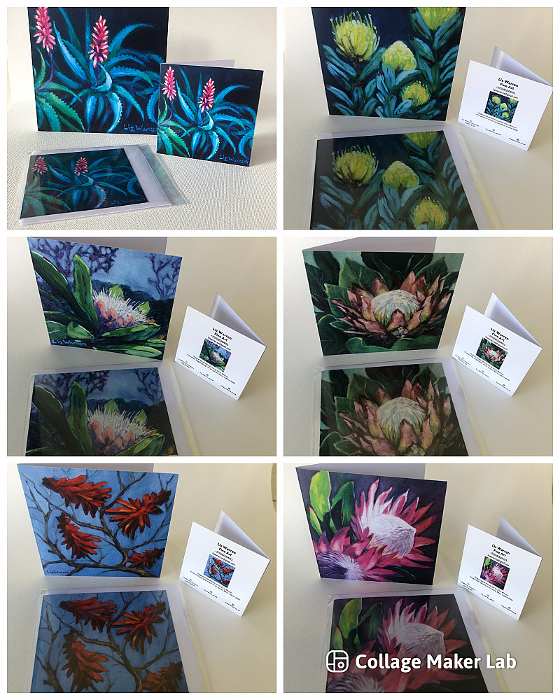 A set of 6 blank greeting cards based on original oil paintings by south African artist, Liz Warren. The cards are 14cm by 14 cm printed on high quality 300gm card. They are individually packaged with an envelope and come packaged in a eco friendly box.