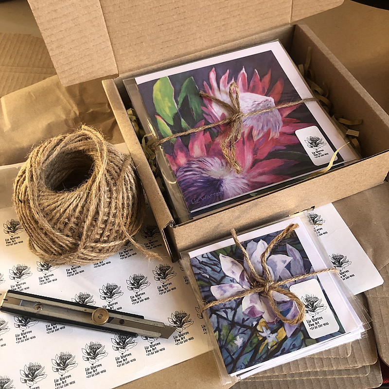 A set of 6 blank greeting cards based on original oil paintings by south African artist, Liz Warren. The cards are 14cm by 14 cm printed on high quality 300gm card. They are individually packaged with an envelope and come packaged in a eco friendly box.